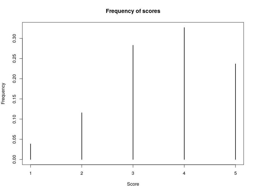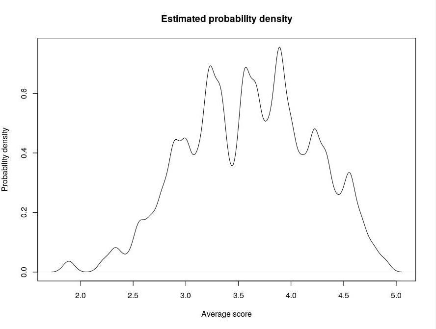 For each single snippet, it was computed the average score, in order to set a proper cut-off to distinguish readable snippets from unreadable ones. The following plots show (i) the frequency of each score and (ii) the (estimated) probability density of the average scores (bandwidth: 0.05):